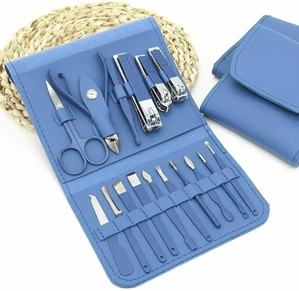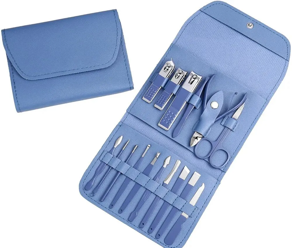 Get the Premium Manicure Set, a sleek blue travel kit with 12 grooming tools like nail clippers and tweezers. Ideal for on-the-go nail care and personal grooming