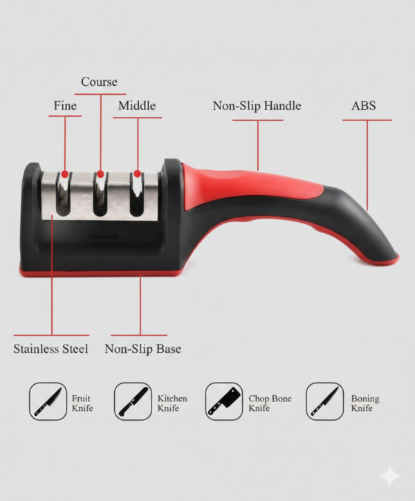 The RS-168 3-Stage Kitchen Knife Sharpener is a powerful manual sharpening tool designed to restore dull knives to razor-sharp precision in minutes. Featuring three sharpening slots for coarse grinding, fine sharpening, and polishing, it delivers professional results at home. Its ergonomic handle and non-slip base ensure maximum safety, comfort, and control during use.