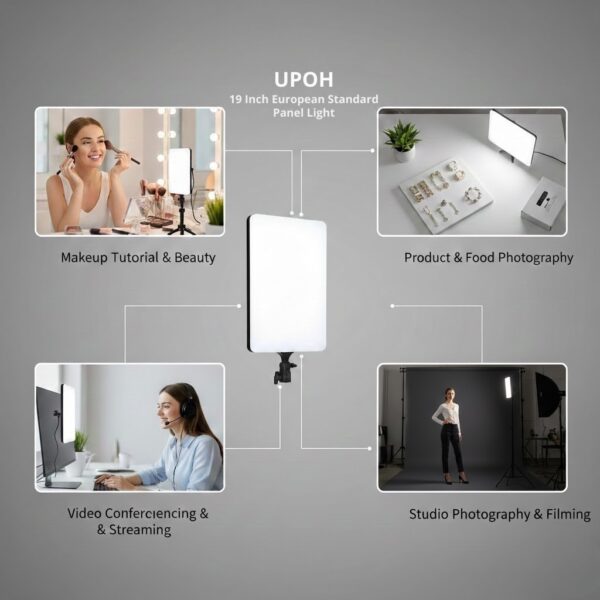 The UPOH RL-19 is a professional 19-inch bi-color LED panel light offering adjustable color temperatures from 2700K to 6500K and a high CRI of 96+ for exceptional color accuracy. Delivering a powerful 100W output with 7950 lumens, it provides soft, evenly diffused lighting perfect for studio photography, video production, and makeup tutorials. Its design includes a wireless remote control for convenient adjustments and a versatile mounting bracket to suit any workspace.